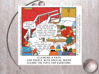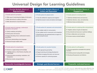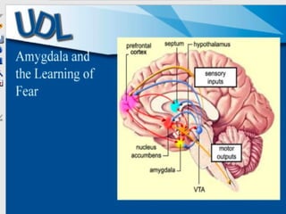 This document discusses Universal Design for Learning (UDL), an educational framework that aims to meet the needs of all learners by reducing barriers in curriculum and instruction. UDL is based on research about how the brain learns and provides multiple means of representation, expression, and engagement. It encourages teachers to understand learner variability, use flexible methods and materials, and foster learner motivation and interest through tapping into their "sparks". The goal is to design inclusive learning environments that can accommodate diverse needs from the beginning rather than making accommodations later.