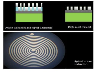 Microelectronics involves the study and manufacturing of very small electronic components on a single semiconductor substrate known as a chip. The key components are integrated circuits (ICs) which contain both active components like transistors and diodes, and passive components like resistors, capacitors, and inductors. There are several fabrication processes used to manufacture ICs, including deposition, photolithography, etching, and doping. ICs provide advantages over discrete components like reduced size, cost, and power consumption.