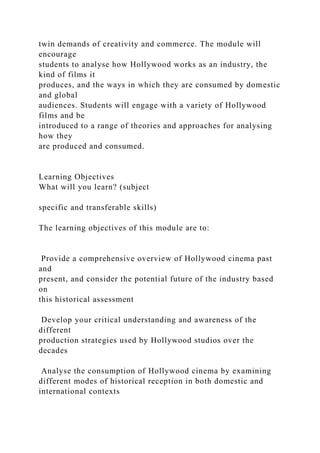 The document outlines a module titled 'The Hollywood Studio System' (code AMAM5042B) for level 5 students, focusing on the evolution of Hollywood as an industry from silent to contemporary cinema. Students will explore production strategies, film consumption, and critical analysis of various films while developing transferable skills through research and project management. The module includes a mix of lectures, screenings, and reading materials to support learning outcomes and engagement with key concepts in Hollywood cinema.