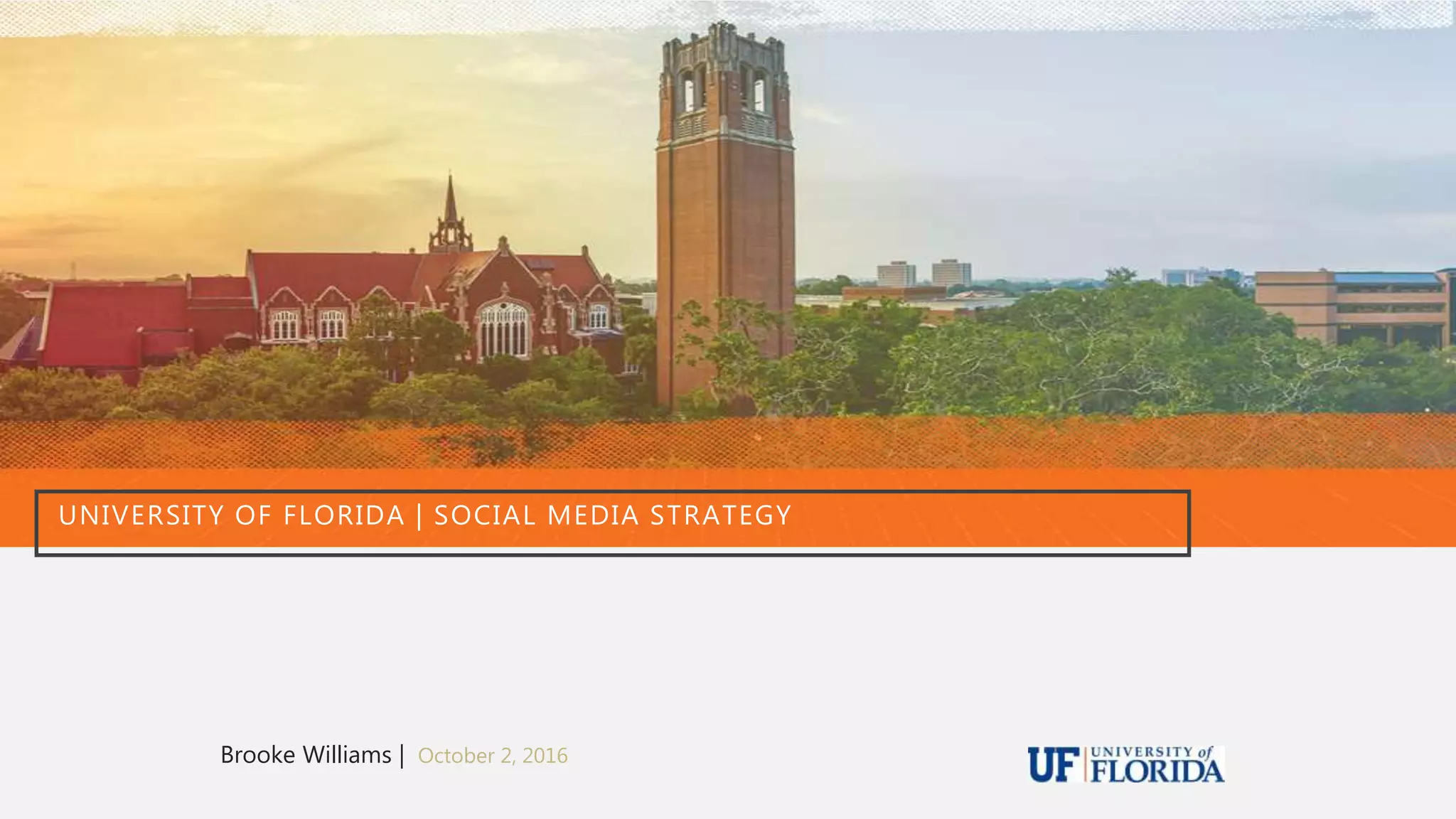The document outlines the University of Florida's 2016 social media strategy, which includes objectives of growing their online presence through follower counts and engagement on social media platforms like Twitter, Facebook, Instagram, YouTube and LinkedIn in order to increase student enrollment. A social media audit analyzes each platform's performance and competitor analysis is also included, along with strategies, tools, timing of posts, roles and responsibilities, policies, and critical response plans for potential incidents. The strategy aims to create more innovative and engaging content to attract new audiences and encourage current users to interact more on social media.