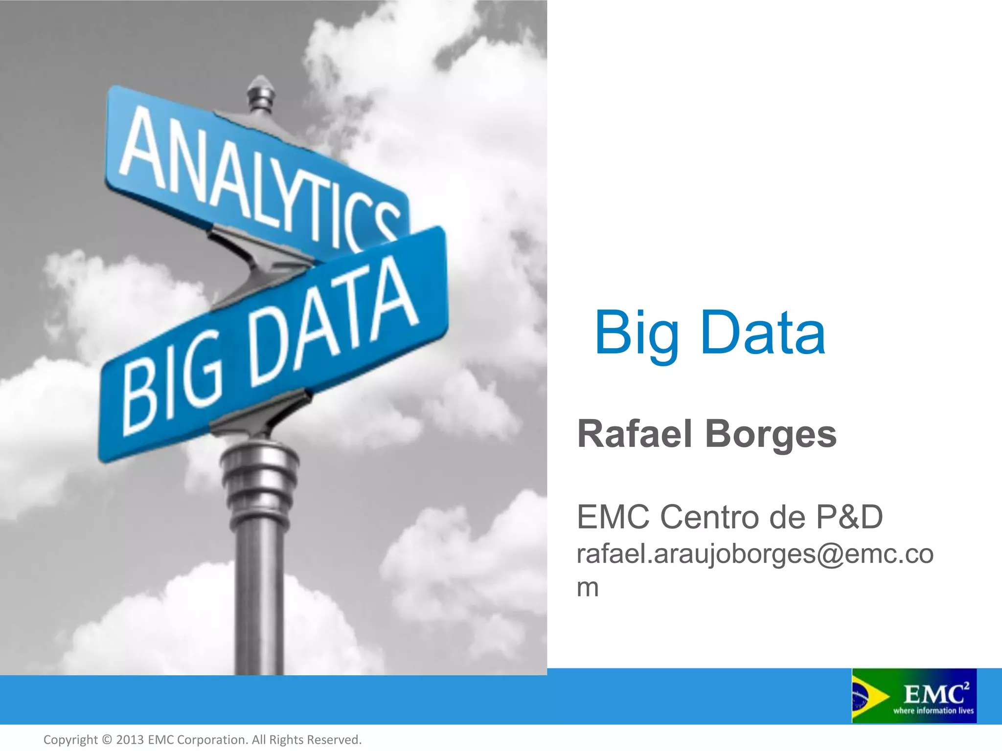 The document discusses big data and EMC's expertise and strategy around big data. It provides definitions of big data, describes the massive growth of digital data and challenges of managing unstructured data. It outlines EMC's R&D center in Brazil focused on big data and collaboration. It also distinguishes between business intelligence and data science, the importance of predictive analytics, and the role of data scientists. Finally, it outlines EMC's oil and gas strategy and examples of big data applications and technologies across the upstream exploration and production process.