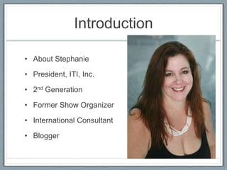 The document provides an overview of navigating the U.S. market for international trade, emphasizing geographical and economic facts, cultural differences, and characteristics of the exhibition business. It highlights the importance of punctuality, meeting deadlines, and direct communication in American business practices. Strategies for launching exhibitions and recruiting exhibitors are discussed, with recommendations for successful market entry through partnerships and effective marketing techniques.