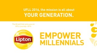 This document provides information about marketing Lipton tea to millennials in Vietnam. It discusses the target group of millennial first jobbers aged 20-25 who are undergoing a transformation from student to professional life. The challenge is to make Lipton tea bags appeal to this group by being a "mental friend" during this stage. A marketing campaign is proposed to identify insights about what matters to this group and their perceptions of tea drinking. The campaign would introduce Lipton into their daily occasions in a positive way and be deployed through consumer communication, promotions, and a budget plan.