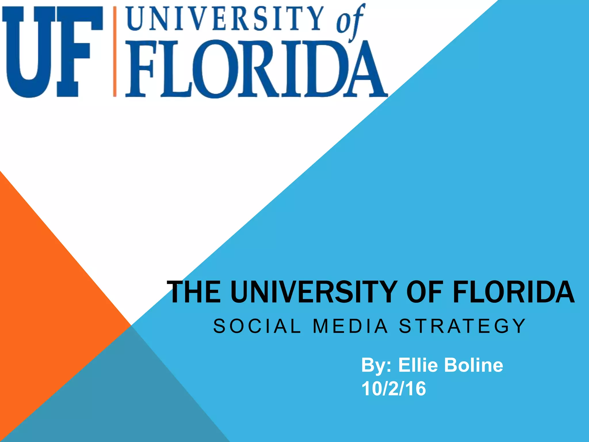 The University of Florida social media strategy aims to increase engagement, improve content for all ages, and grow their following. Their goals are to post more photos and videos, tailor content for different demographics, and increase Instagram followers. Key dates include reporting progress quarterly and posting around holidays. Roles include the Director of Digital Communications managing platforms and a Social Media Specialist approving posts. Response plans address hacked accounts and inappropriate content.