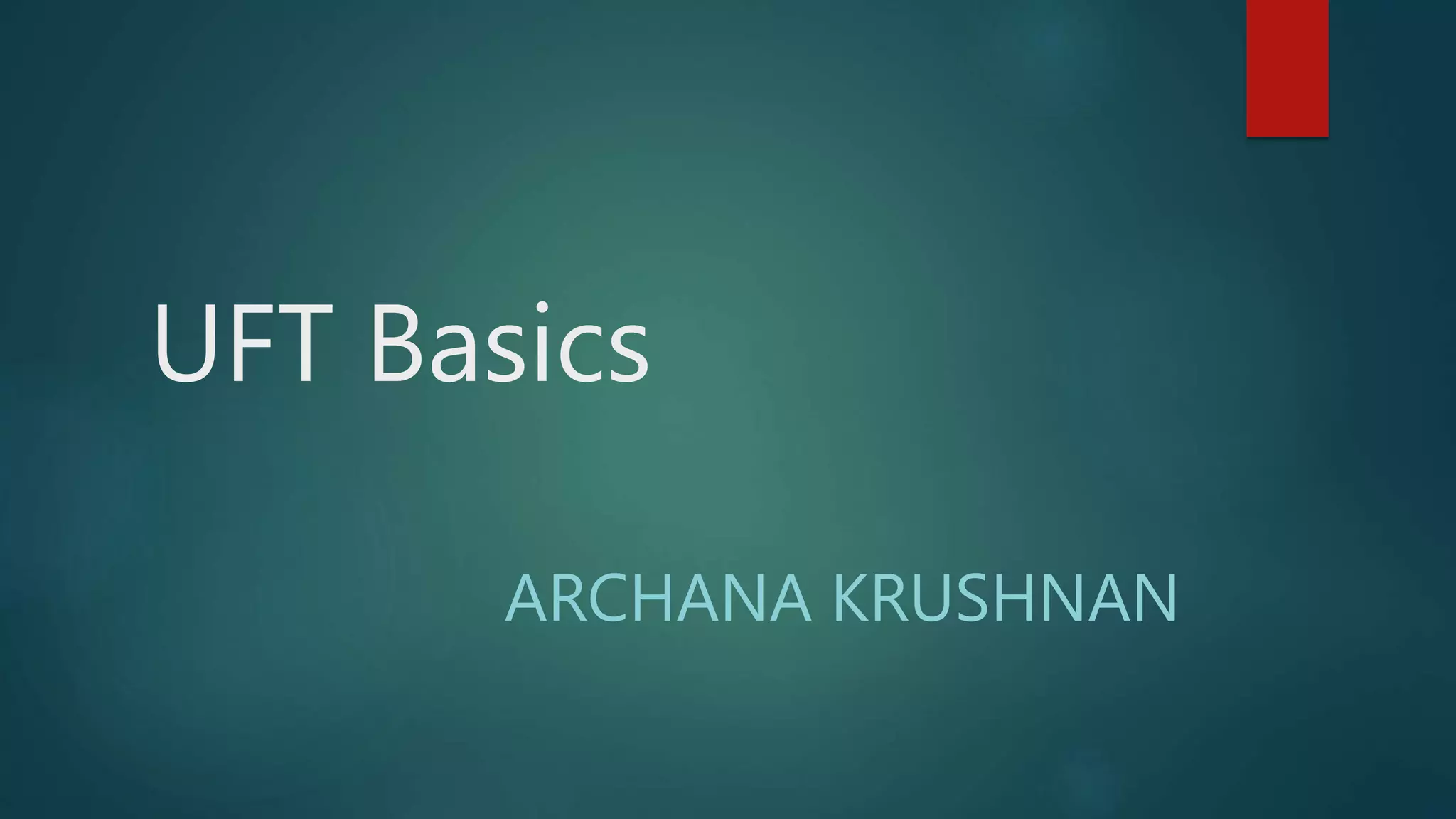 The document provides an overview of the HP UFT IDE and its main features. It discusses the solution explorer, menu bar, properties window, tool box, output tab, and error pane. It also covers keyword and expert views, record and playback functionality, object identification, test results, checkpoints, error handling, and recovery scenarios. The document was prepared by Archana Krushnan, a test analyst with over 5 years of experience in software testing.