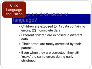 Children are able to acquire language despite being exposed to incomplete and erroneous data. Chomsky's theory of Universal Grammar (UG) explains this by proposing that the human brain contains innate knowledge about language in the form of principles and parameters. According to UG, all languages share common structural properties governed by principles, but they can vary in terms of parameters like word order. UG allows for both systematicity and variation across languages during language acquisition.