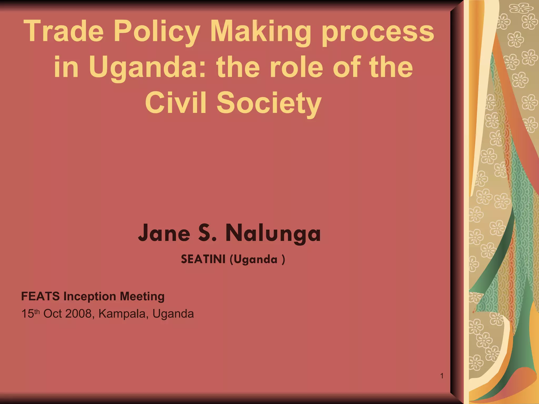 The document summarizes the trade policy making process in Uganda and the role of civil society organizations (CSOs). It describes how the Ugandan government developed a National Trade Policy in 2007 with input from stakeholders like CSOs. CSOs participated in consultations and provided feedback to policy drafts with the aim of creating a pro-human development trade policy. However, CSO engagement was ad hoc and their influence was limited. Moving forward, the document recommends that CSOs more actively monitor implementation and strategize for participating in the next policy review.
