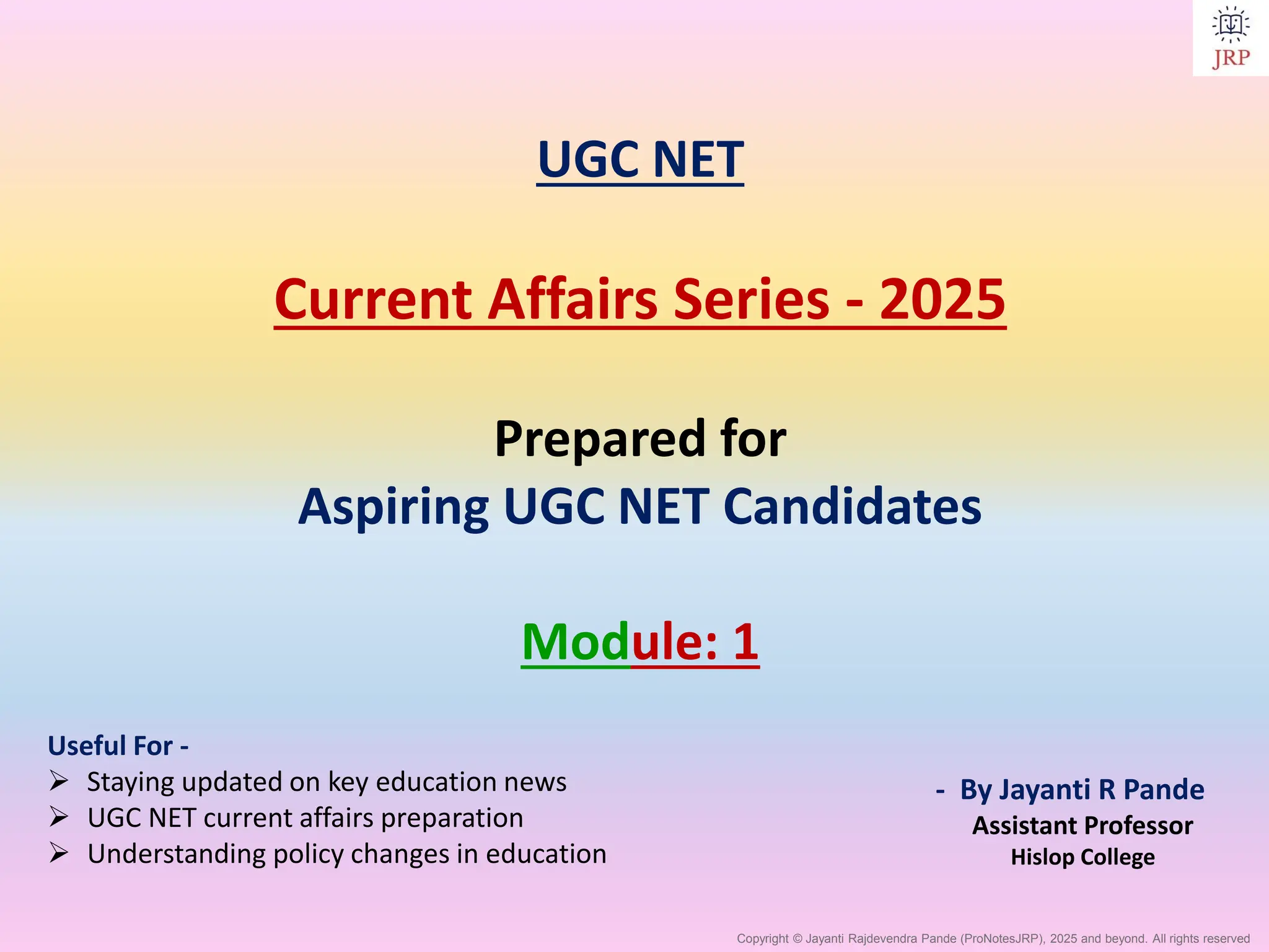 Rajdevendra Pande (ProNotesJRP), 2025 and beyond. All rights reserved UGC NET Current Affairs Series - 2025 Prepared for Aspiring UGC NET Candidates Module: 1 Useful For - Staying updated on key education news UGC NET current affairs preparation Understanding policy changes in education - By Jayanti R Pande Assistant Professor Hislop College