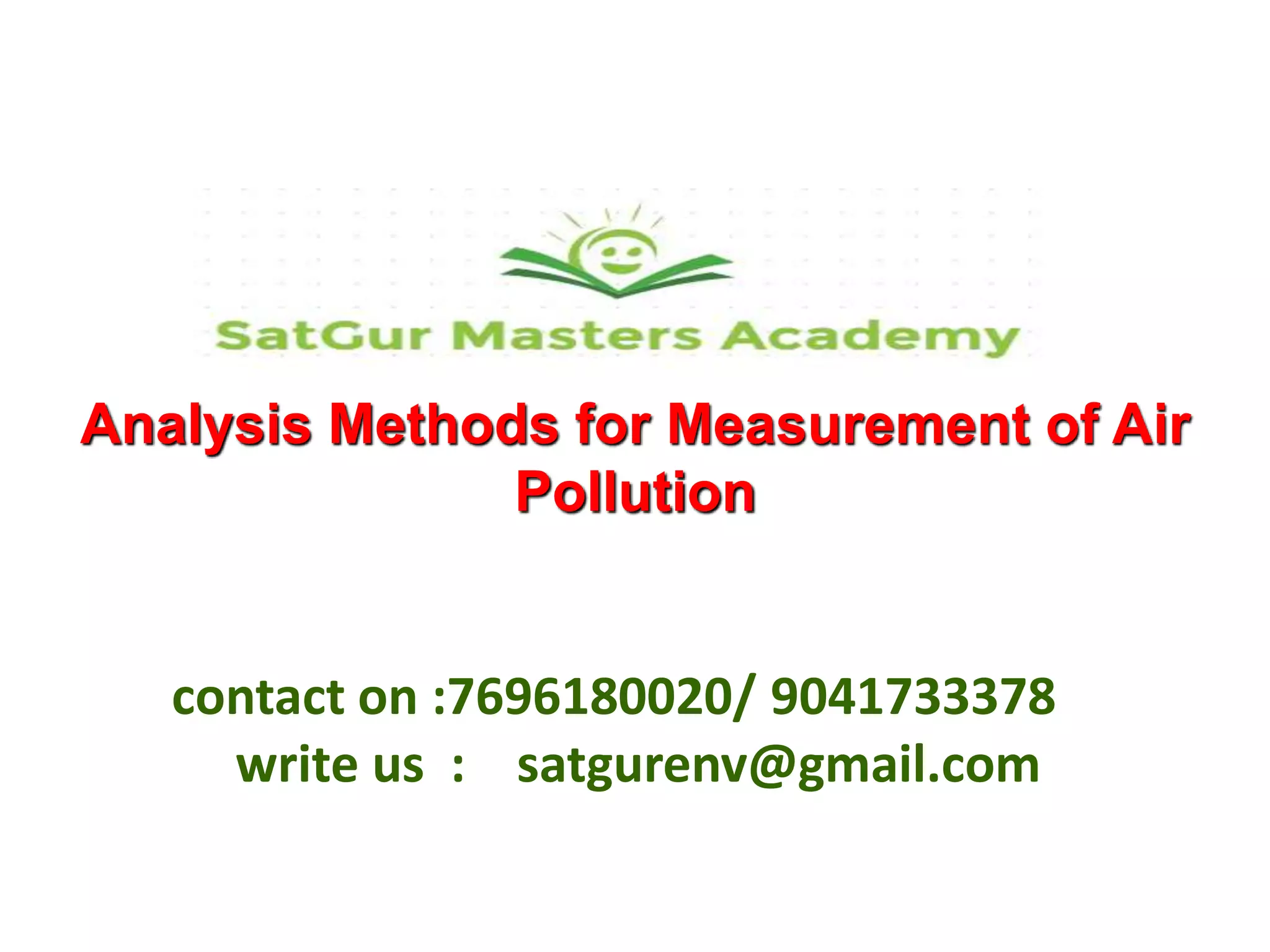 The document discusses various methods for analyzing air pollution, focusing on gaseous pollutant sampling and measurement techniques. It details the requirements for sampling flow rates, sampling periods, and conditions for valid samples, as well as specific wet chemical methods for different pollutants. Additionally, it mentions various analytical methods and offers resources for students and professionals in environmental sciences.