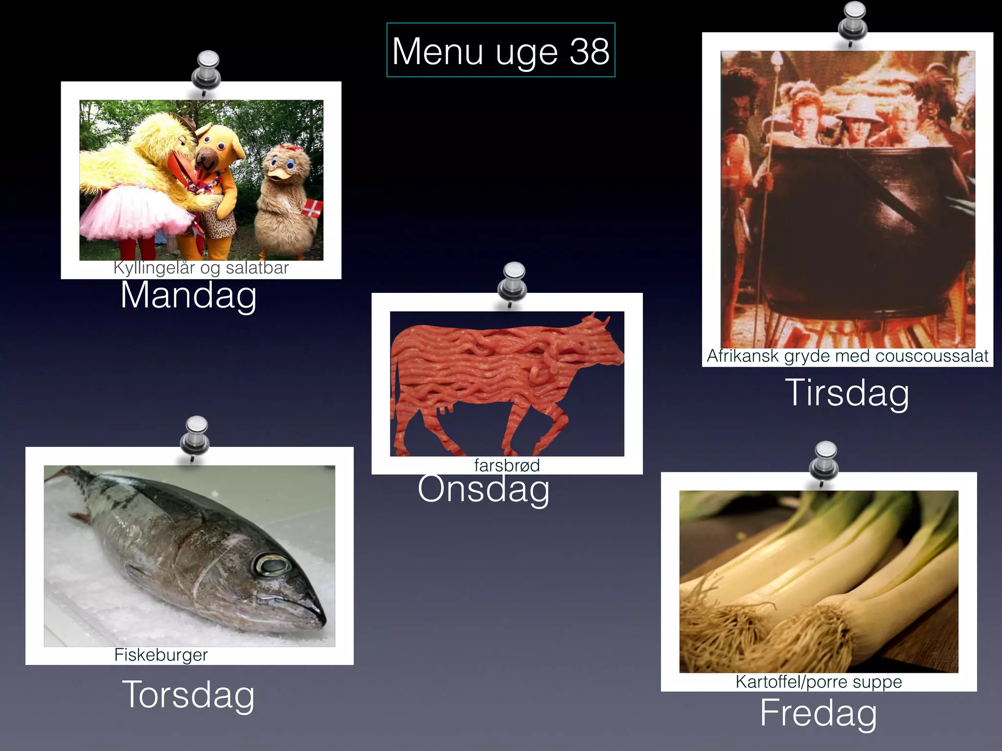 og salatbar Mandag Afrikansk gryde med couscoussalat Tirsdag farsbrød Onsdag Fiskeburger Kartoffel/porre suppe Torsdag Fredag