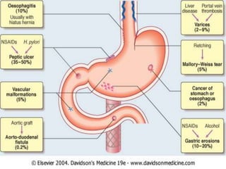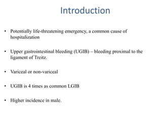 Upper gastrointestinal bleeding (UGIB) is a potentially life-threatening emergency caused by bleeding in the esophagus, stomach, or duodenum. Common causes include esophageal/gastric varices, ulcers, cancers, and esophagitis. Signs include hematemesis, melena, and hematochezia. Initial treatment involves stabilizing the patient, identifying the source of bleeding through endoscopy, and administering treatments like band ligation, injection therapy, or anti-secretory drugs. Surgery may be required for persistent or recurrent bleeding after other measures fail.
