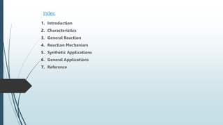 The document describes the Ugi reaction, a multi-component reaction where a ketone or aldehyde, amine, isocyanide, and carboxylic acid come together to form a bis-amide. It was first reported in 1959 by Ivar Karl Ugi. The reaction has high atom economy and yields, occurs rapidly at room temperature, and is uncatalyzed. It has applications in synthesizing chemical libraries and multiple compounds in one step, such as the HIV drug Crixivan. The mechanism involves imine formation, proton exchange, additions of the isocyanide and carboxylic acid, and a Mumm's rearrangement.