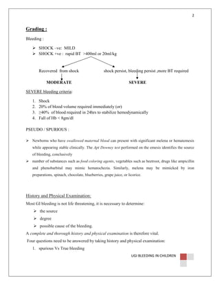 Upper gastrointestinal bleeding in children can be caused by variceal sources such as portal hypertension or non-variceal sources like ulcers. Initial management involves hemodynamic resuscitation and endoscopy to identify the source of bleeding. For variceal bleeding, pharmacologic therapy with vasoactive drugs and endoscopic variceal ligation or sclerotherapy can help stop bleeding. Surgical options are considered if conservative measures fail. Prognosis is poorer if the bleeding site cannot be identified, coagulation disorders are present, or significant blood loss occurs without intervention.