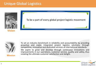 UGL provides integrated project logistics solutions globally. It aims to be the benchmark in reliability and accountability by offering proactive and viable logistics services. Its vision is to grow through continuous innovation, improving operations and customer satisfaction. It offers services including project logistics, oil and gas support, sea and air freight forwarding, and heavy lift logistics.