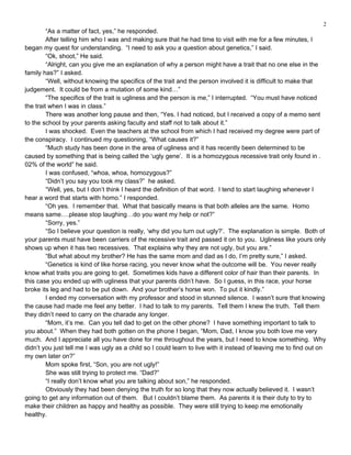 The document is a humorous narrative where the author, Nathanael W. Dungan, reflects on his shocking realization of perceived ugliness and the aftermath of discovering an 'ugly gene' supposedly inherited from his parents. Throughout his journey, he engages in comedic conversations with family, friends, and a professor to uncover the truth behind his appearance, only to find out that it was all a cruel prank by his roommates. Ultimately, Dungan learns that there is no such thing as an 'ugly gene,' highlighting themes of self-acceptance and the absurdities of societal perceptions of beauty.