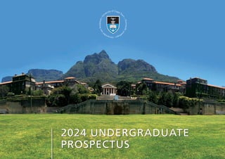 This document provides information for prospective undergraduate students at the University of Cape Town (UCT) for the 2024 academic year. It begins with a message from the Vice-Chancellor welcoming students to UCT and outlining its commitment to social justice. The document then provides an overview of UCT's six faculties and the qualifications offered. It also includes information on student life, housing, sports, international students, tuition fees, funding options, and contact details.