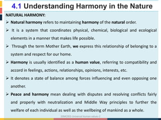 The document discusses the concept of harmony in nature, highlighting the interconnectedness of the four orders of nature: material, pranic, animal, and human. It emphasizes the importance of maintaining ecological balance and the consequences of human actions that disrupt this harmony, leading to sustainability crises. It calls for a return to living responsibly with nature and learning from cultures that have managed to coexist sustainably.