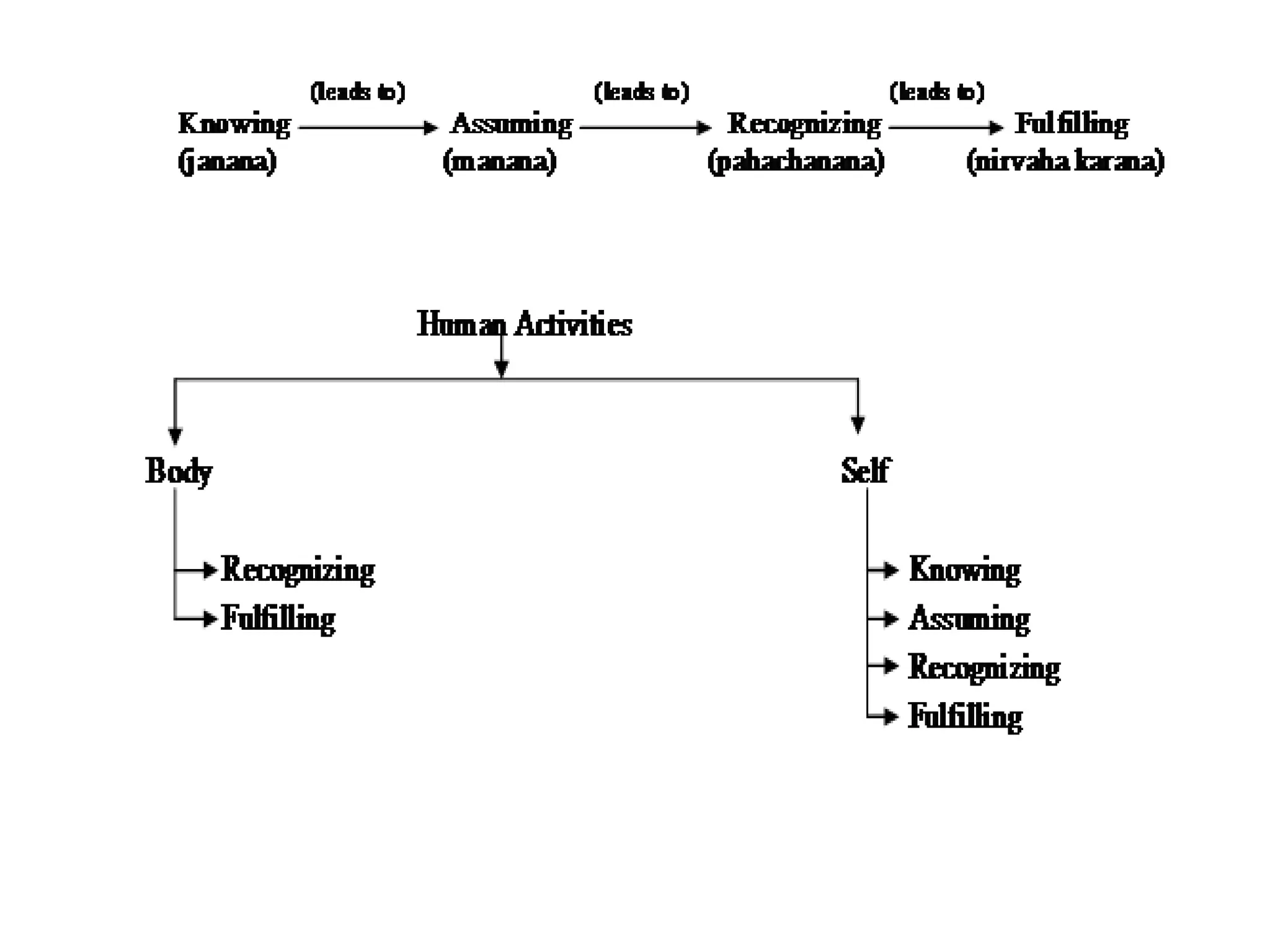 This document discusses harmony in the human being by examining the relationship between the self ("I") and the body. It explains that the human being is a co-existence of the self and body, with an exchange of information between the two. The needs of the self are continuous feelings like happiness, while the needs of the body are temporary physical facilities. It also analyzes the different activities of the self, like imaging, analyzing, selecting, and tasting, using the example of desiring respect through home ownership.