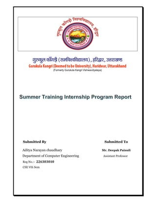 The document is a report submitted by Aditya Narayan Chaudhary about his summer training internship at MIND LUSTER focused on UI/UX design. It includes sections on the UI/UX design process, different design processes and their applications, details about his finance app project, and conclusions. The training provided practical experience in applying skills learned in class to develop new design ideas that could change human-computer interaction.