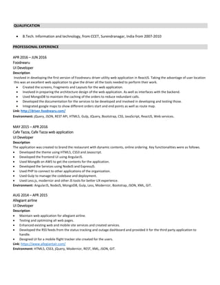 The document is a detailed resume of Nileshkumar M Patel, a full stack developer with over 5 years of experience in web application development, focusing on front-end and back-end technologies. It highlights skills in JavaScript frameworks, database management, and software methodologies, along with professional experience in various industries including UI development for applications in both e-commerce and service sectors. Additionally, it outlines specific projects and responsibilities undertaken at various companies, demonstrating a strong track record of successful project deliveries and technical expertise.