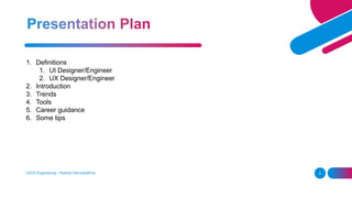 The document discusses the distinctions and roles of UI (User Interface) and UX (User Experience) design, emphasizing that while they are intertwined, each serves different purposes; UI focuses on aesthetics and usability, while UX emphasizes user behavior and functional experience. It outlines the skills required for UI/UX designers and engineers, the importance of designing with user needs in mind, and the principles that guide effective design, such as consistency, hierarchy, and accessibility. Additionally, it highlights the collaborative nature of the roles within product design and the iterative process involved in creating user-friendly software.