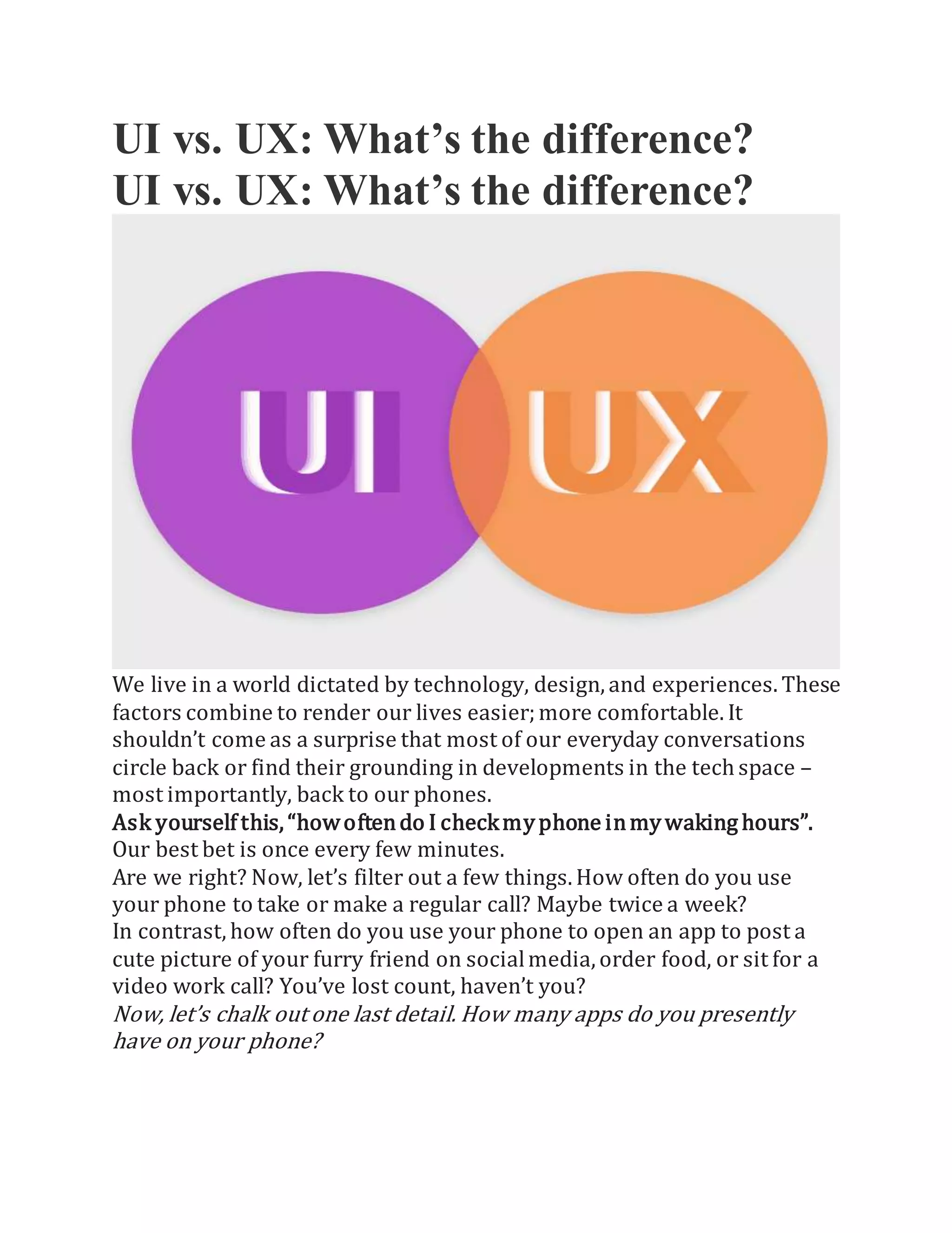 UI design focuses on the visual and interactive elements of a product like buttons, menus and graphics. The goal is to make the interface easy to use. UX design focuses more broadly on the overall user experience including how usable, useful and satisfying the product is for users. UX design considers interface design but also information architecture and usability testing. While UI design deals with how a product looks, UX design ensures the functionality and experience meet users' needs. Both are important but UX comes first to understand users before designing visual interfaces.