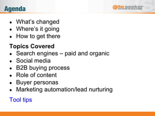 The document discusses the evolving landscape of online marketing, emphasizing the convergence of search engines and social media, along with the importance of understanding buyer personas and content marketing strategies. It highlights the impact of mobile devices on marketing practices and offers tips on automation and lead nurturing to improve engagement and conversion rates. Key takeaways include the necessity of aligning marketing efforts with user needs, the significance of measuring campaign effectiveness, and the importance of an integrated approach to internet marketing.