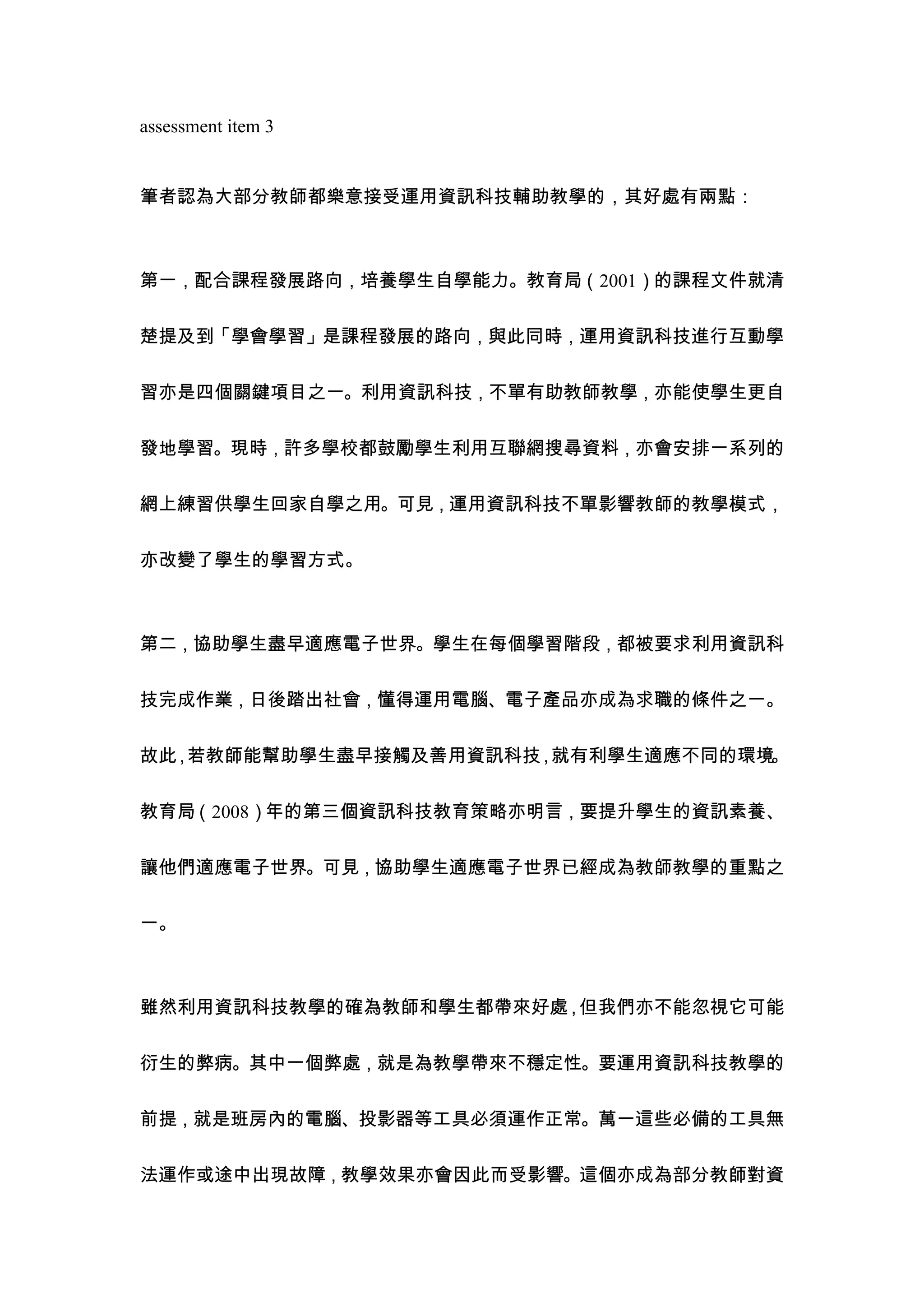 文档讨论了教师乐于运用信息科技辅助教学的两个主要好处:一是促进学生自学能力的发展,二是帮助学生适应电子世界。虽然信息科技教学可能带来不稳定性,但其好处依然显著,因此建议继续使用信息科技辅助教学。教育局的策略强调了提升学生的信息素养的重要性。
