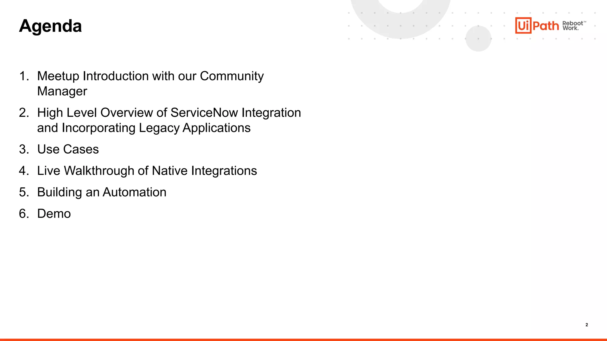 The document discusses how UiPath and ServiceNow can be used to automate mainframe and other legacy systems. It provides an agenda for a meetup on this topic, including an introduction, overview of the ServiceNow integration, use cases, live walkthroughs of integrations and building an automation, and a demo. The rest of the document describes how robotic process automation (RPA) can connect legacy systems to ServiceNow, providing examples of automations that are triggered from either RPA or ServiceNow. It also demonstrates the available UiPath activities for ServiceNow and how the UiPath Spoke connector allows launching UiPath robots from ServiceNow. Joint customer use cases are presented and the document concludes with links to documentation.