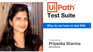 The document discusses using UiPath Test Suite for continuous integration and testing of robotic process automation (RPA) workflows. It covers building test cases and data-driven test cases, executing tests with Orchestrator, and mobile device automation. The goal of Test Suite is to make RPA a low-maintenance activity by enabling proactive testing and maintenance through continuous integration and testing.