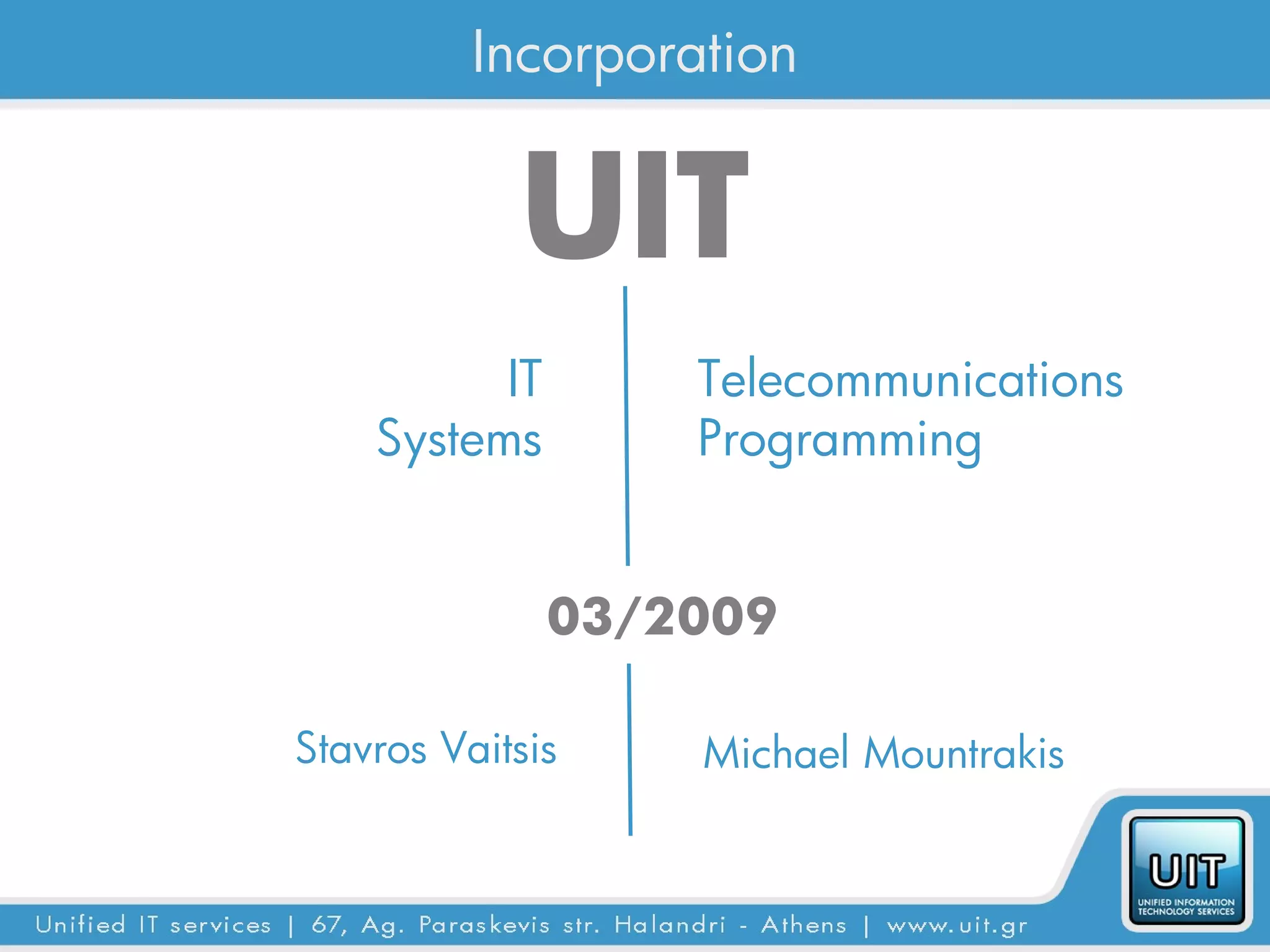 The document provides information about a company that offers IT, telecommunications, and custom software services. The company was established in 2009 in Athens, Greece and has 10 employees with expertise in IT, programming, systems, and telecommunications. It generates approximately 300k Euro in annual revenue. The company provides consulting, project development, customized software solutions, training, and technical support services.