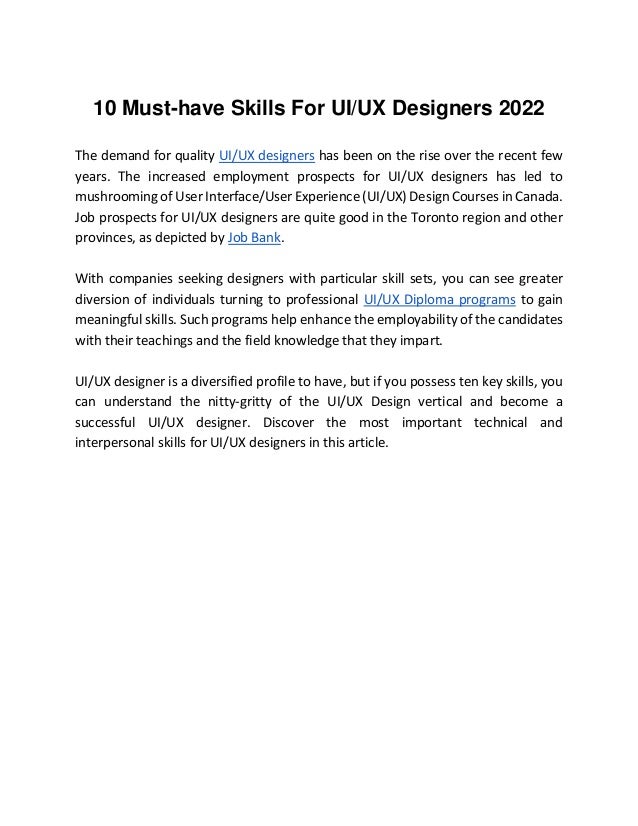 The document outlines the increasing demand for UI/UX designers and highlights ten essential skills required for success in this field, including technical abilities like user research and prototyping, as well as interpersonal skills such as collaboration and empathy. It emphasizes the importance of a formal education in UI/UX design to enhance employability and gain relevant skills. The document also illustrates how these skills contribute to creating user-centric digital products.