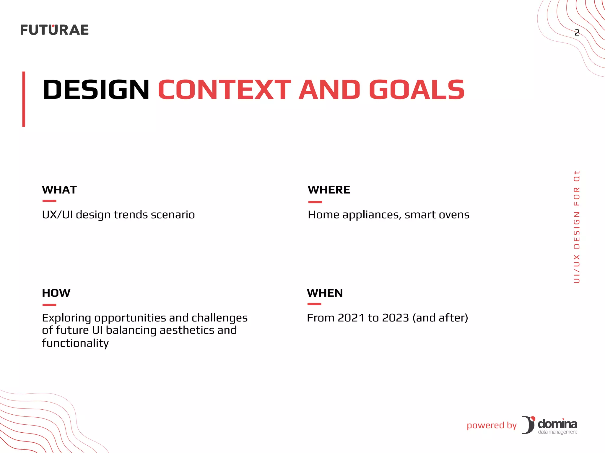 The document outlines UX/UI design trends for smart ovens using Qt technology, highlighting advancements in mixed interaction, personalization, and simplification. Key features include touch screens, smart cooking systems, and enhanced connectivity with companion applications. It also presents design guidelines emphasizing 3D elements, typographic clarity, and modern aesthetics for various hardware configurations.