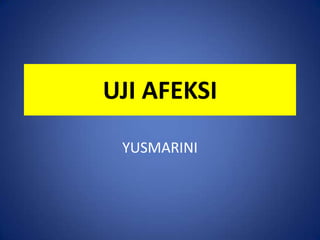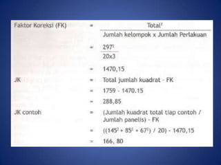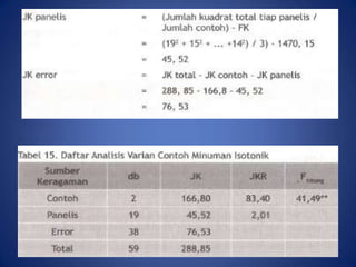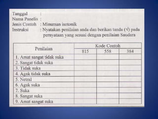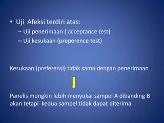 Dokumen ini membahas berbagai jenis uji afeksi, termasuk uji penerimaan dan uji kesukaan, serta perbedaan mendasar antara uji pembedaan dan uji afeksi. Penjelasan tentang uji hedonik menunjukkan aplikasinya dalam pengembangan produk, termasuk contoh perbaikan selai kacang dan pengembangan minuman isotonik, dengan pemakaian skala hedonik untuk menilai kesukaan konsumen. Hasil analisis menunjukkan signifikansi dalam preferensi rasa produk yang diuji, memberikan dasar untuk pemasaran produk baru.