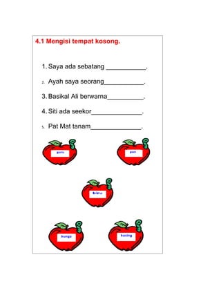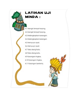 Dokumen tersebut berisi serangkaian latihan uji minda yang meliputi mengisi tempat kosong, melengkapkan karangan, menyusun ayat, teka silang kata, dan karangan ringkas bertema binatang peliharaan. Latihan-latihan tersebut bertujuan untuk menguji kemampuan berbahasa dan kreativitas peserta.