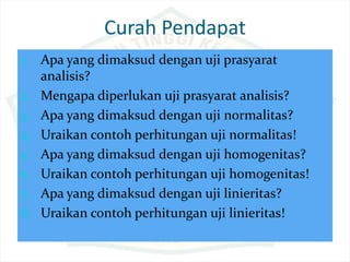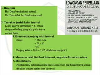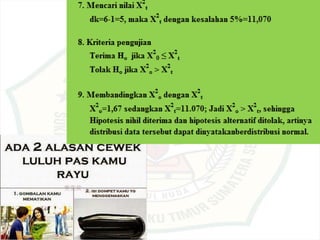 Dokumen ini membahas tentang konsep hati yang mati dan pentingnya pengujian prasyarat analisis dalam statistika, termasuk uji normalitas, homogenitas, dan linieritas. Terdapat penjelasan terkait karakteristik kepribadian berdasarkan bentuk jari, serta langkah-langkah dalam melakukan uji statistik seperti uji Lilliefors dan uji chi-square. Penekanannya adalah pada metode statistik yang tepat berdasarkan distribusi data yang ada.