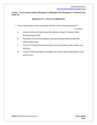 Dokumen ini adalah kertas ujian bulanan untuk lukisan kejuruteraan tingkatan 4 yang merangkumi soalan objektif dan subjektif serta esei tentang perisian AutoCAD. Ia terdiri daripada beberapa bahagian termasuk kelebihan dan kekurangan penggunaan sistem CAD berbanding kaedah konvensional serta bukti aplikasi perisian AutoCAD. Terdapat juga skema jawapan yang menawarkan panduan untuk penilaian.
