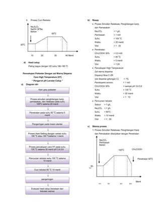 Dokumen tersebut membahas tentang proses pencelupan kain poliester dan poliamida dengan zat warna dispersi dan reaktif dengan variasi suhu, pH, dan resep pencelupan untuk mendapatkan hasil celup yang optimal. Diuraikan proses simultan, penetralan, pencelupan cara high temperature, carrier, pad thermosol, dan exhaust beserta skemanya serta hasil yang didapat dari variasi suhu heat setting dan resep pencelupan.