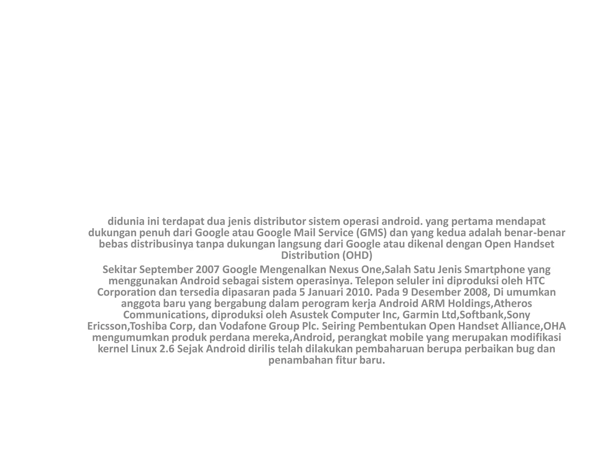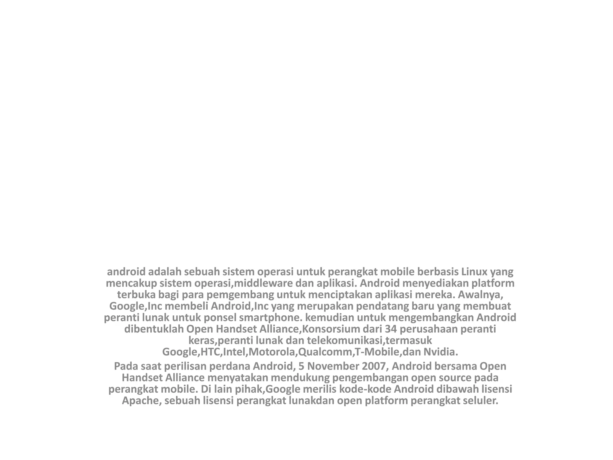 Android adalah sistem operasi berbasis Linux untuk perangkat mobile yang diciptakan Google melalui akuisisi Android Inc. dan kolaborasi dengan Open Handset Alliance. Sejak diluncurkan pada 5 November 2007, Android mengalami berbagai pembaruan versi yang menambahkan fitur baru dan perbaikan bug, serta mendukung pengembangan aplikasi oleh berbagai vendor. Saat ini, Android menjadi sistem operasi dominan di smartphone dan tablet, berkompetisi secara langsung dengan Apple.