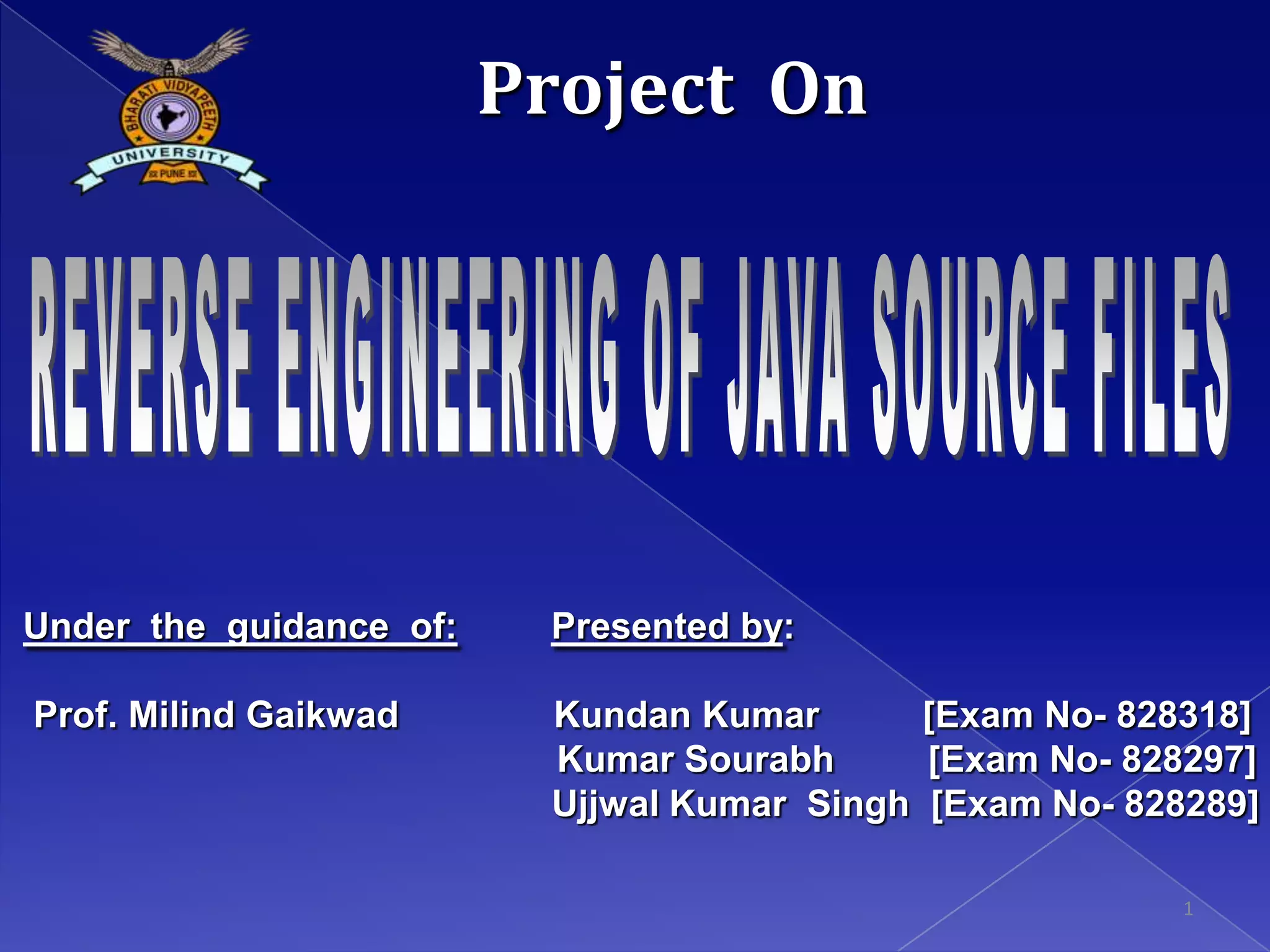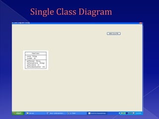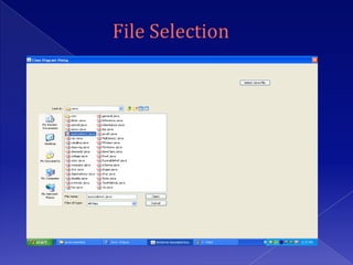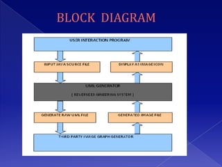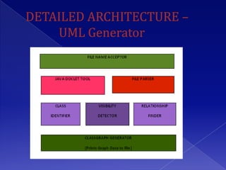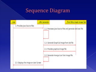 The document describes a project to develop software to reverse engineer Java source code files and generate UML class diagrams. The software takes Java source files as input, parses them using Java tools, and identifies classes, attributes, relationships between classes. It then generates dot files that are converted into images displaying the class diagrams. The diagrams show classes, attributes, methods, and relationships like inheritance, aggregation, and dependencies. The software is intended to help understand object models from existing Java code.