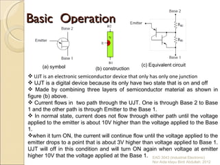 The unijunction transistor (UJT) is a three-terminal semiconductor device that has two operating states: on and off. It consists of three layers of semiconductor material. Current flows through two paths - from the emitter to base 1, and from base 2 to base 1. The UJT turns on when the emitter voltage is about 10V higher than the base 1 voltage, and turns off when the emitter voltage drops to about 3V higher. UJTs are used in relaxation oscillators where a capacitor charges until the UJT turns on and discharges the capacitor, then the UJT turns off and the process repeats.