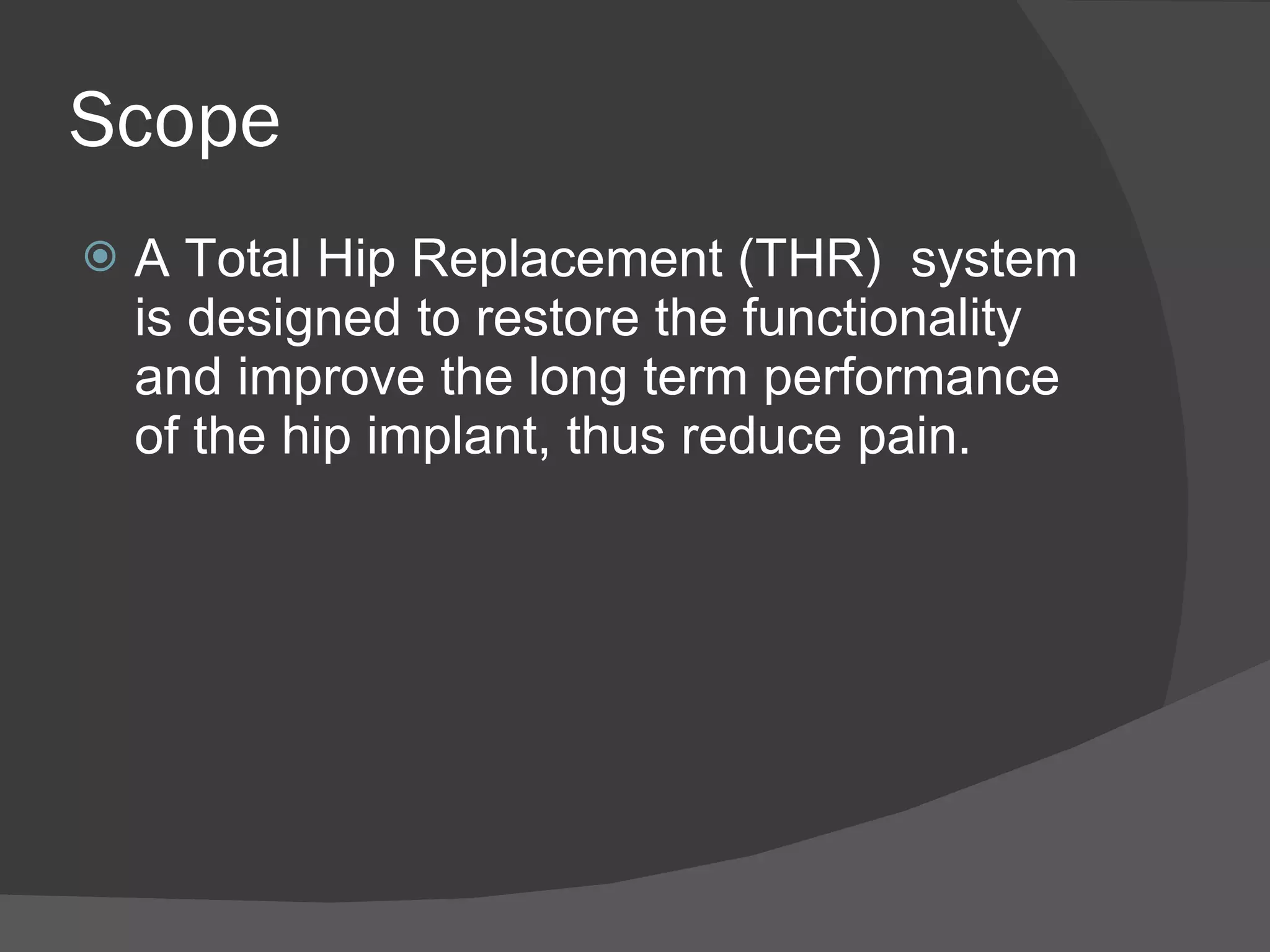 A total hip replacement (THR) system is designed to restore hip functionality and improve long-term performance by reducing pain. A THR involves surgically replacing damaged hip joints with prosthetic components, including a femoral stem, femoral head, and acetabulum cup. The design of this THR system was created using inputs like commercially available prosthetic femurs and considers features like a collar for ease of removal and weight transfer between components.