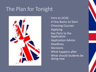 This document provides information about applying to UK universities through UCAS. It outlines the UCAS application process in 12 steps, including choosing courses, filling out the application, writing a personal statement, and submitting transcripts. Key deadlines are in October, January, and March. Students can track the progress of their application on UCAS Track. They may receive conditional offers and have the options to hold offers, enter clearing if rejected, or use adjustment if exceeding conditions. The presentation aims to guide students through successfully navigating the UK university application process.
