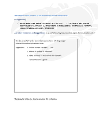 The document is a feedback form for a conference held in Uganda. It asks the respondent for details like name and company. It then asks questions to evaluate aspects of the conference like how they heard about it, their reason for attending, if it met their reason, their rating of speakers and content, and suggestions for future conferences. At the end, it thanks them for their feedback.