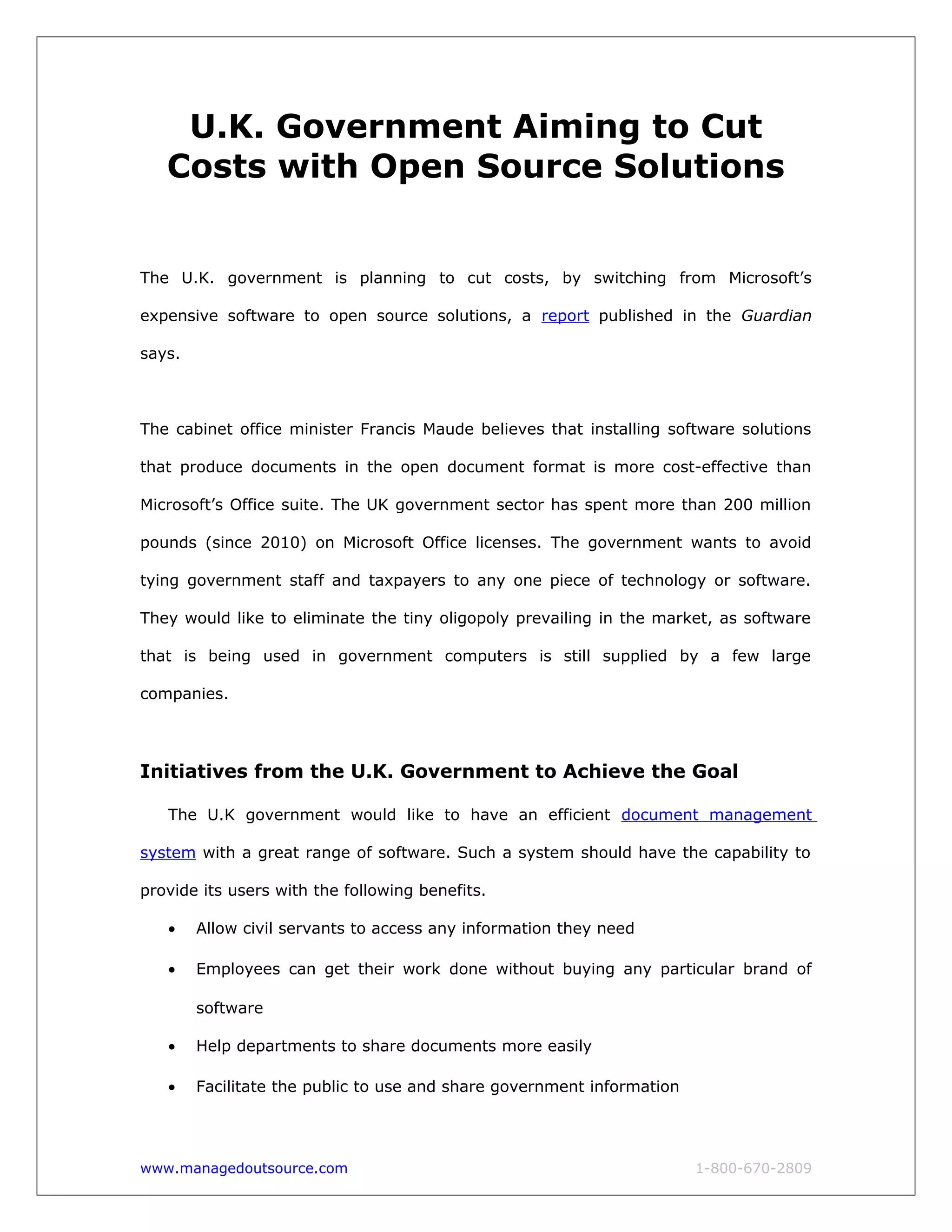 The U.K. government aims to cut costs by transitioning from Microsoft software to open-source solutions, believing that this move can save taxpayer money and reduce reliance on a few large tech companies. To achieve this, they plan to implement open standards for document formats and encourage public involvement in the selection process. The initiative will involve several phases, including collecting user suggestions and creating proposals for new standards, while still allowing the optional use of Microsoft products.