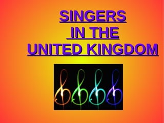 This document provides information on several singers from the United Kingdom. It includes brief biographies of Joss Stone, Alesha Dixon, Harry Styles, Liam Payne, Beverley Knight, Amelle Berrabah, Sandie Shaw, Ali Campbell, and Freddie Mercury, noting their roles as singers, songwriters, musicians, and in some cases television presenters and models from England.
