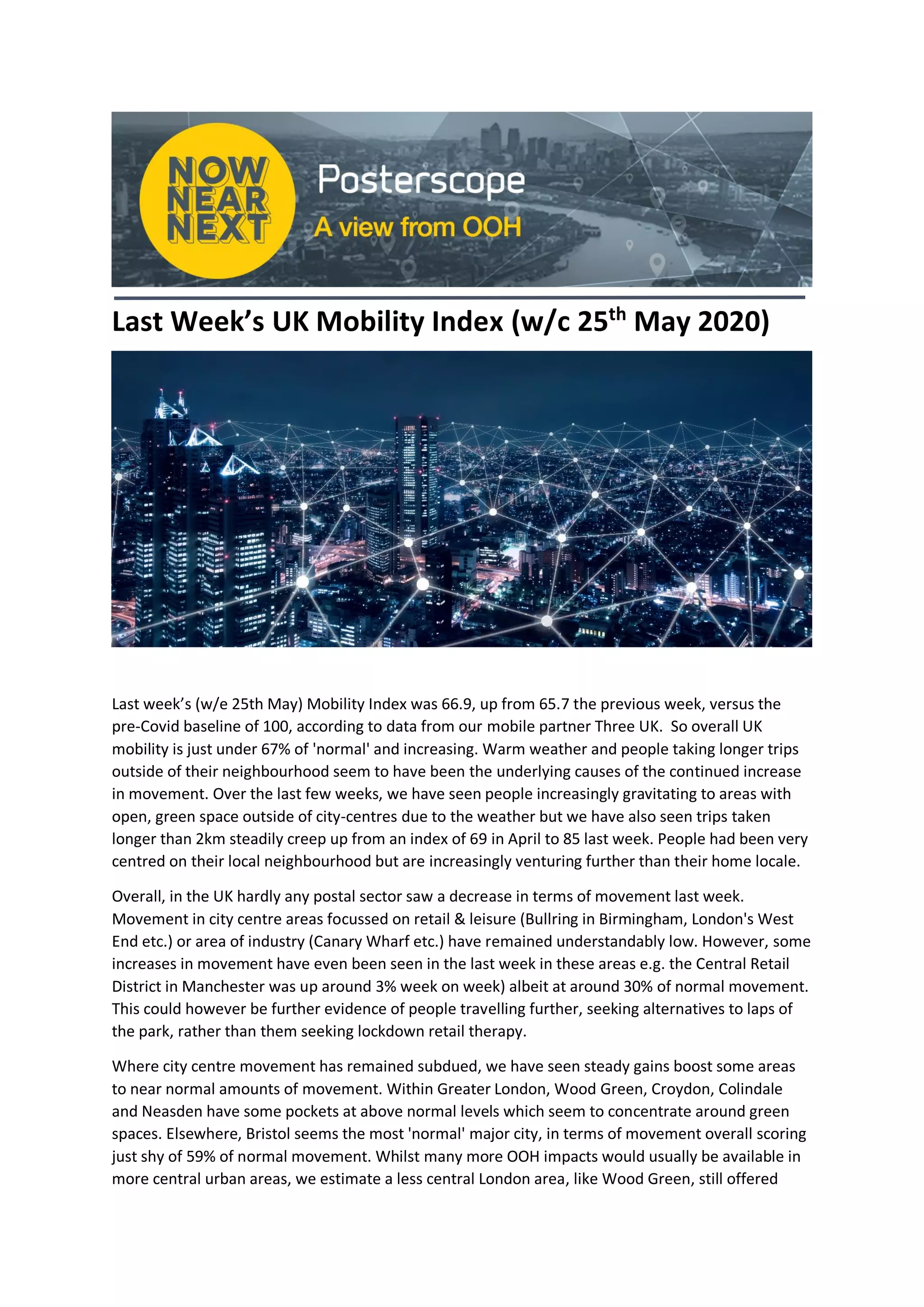 The UK's mobility index rose to 66.9 for the week ending May 25, 2020, indicating a gradual return towards normal movement levels despite being below the pre-COVID baseline of 100. Factors contributing to this increase include warm weather and a growing trend of people taking trips beyond their local neighborhoods, particularly to open green spaces. As the UK begins to reopen schools and other sectors, further shifts in mobility patterns are anticipated, creating new advertising opportunities.