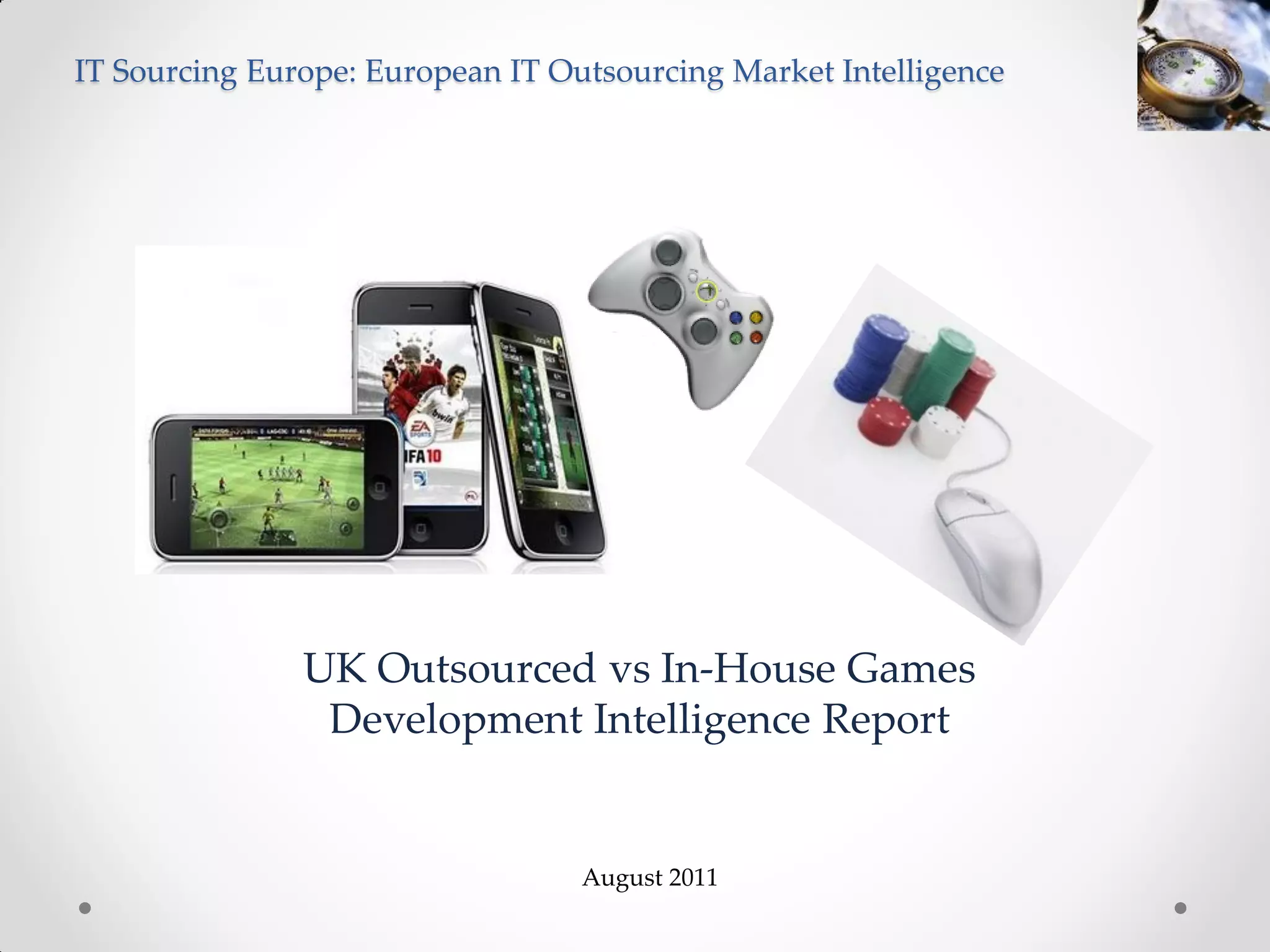 The document presents findings from the first UK gaming outsourcing survey conducted in 2011, which examines the demand for IT resources, trends in outsourcing versus in-house game development, and the challenges faced by UK gaming companies. Key findings include a significant trend towards outsourcing for cost reduction and efficiency, with common outsourced processes being concept development, production, and QA/testing. The report concludes that demand for outsourcing services is likely to increase, driven by cost pressures and a shortage of qualified personnel in the UK gaming industry.