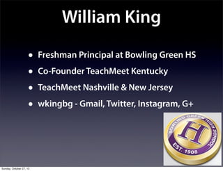This document discusses designing engaging professional development opportunities for teachers. It advocates for professional learning where teachers are active participants, help determine the content, and collaborate with others. Examples of this include TeachMeets, which are informal conferences where teachers lead short sessions on tools and strategies, and EDcamps, which are conferences where session topics are determined the day-of by participants. The document also promotes the use of professional learning networks on Twitter to connect teachers virtually. It provides examples of tools that can be used for flipped learning and job-embedded professional development activities.