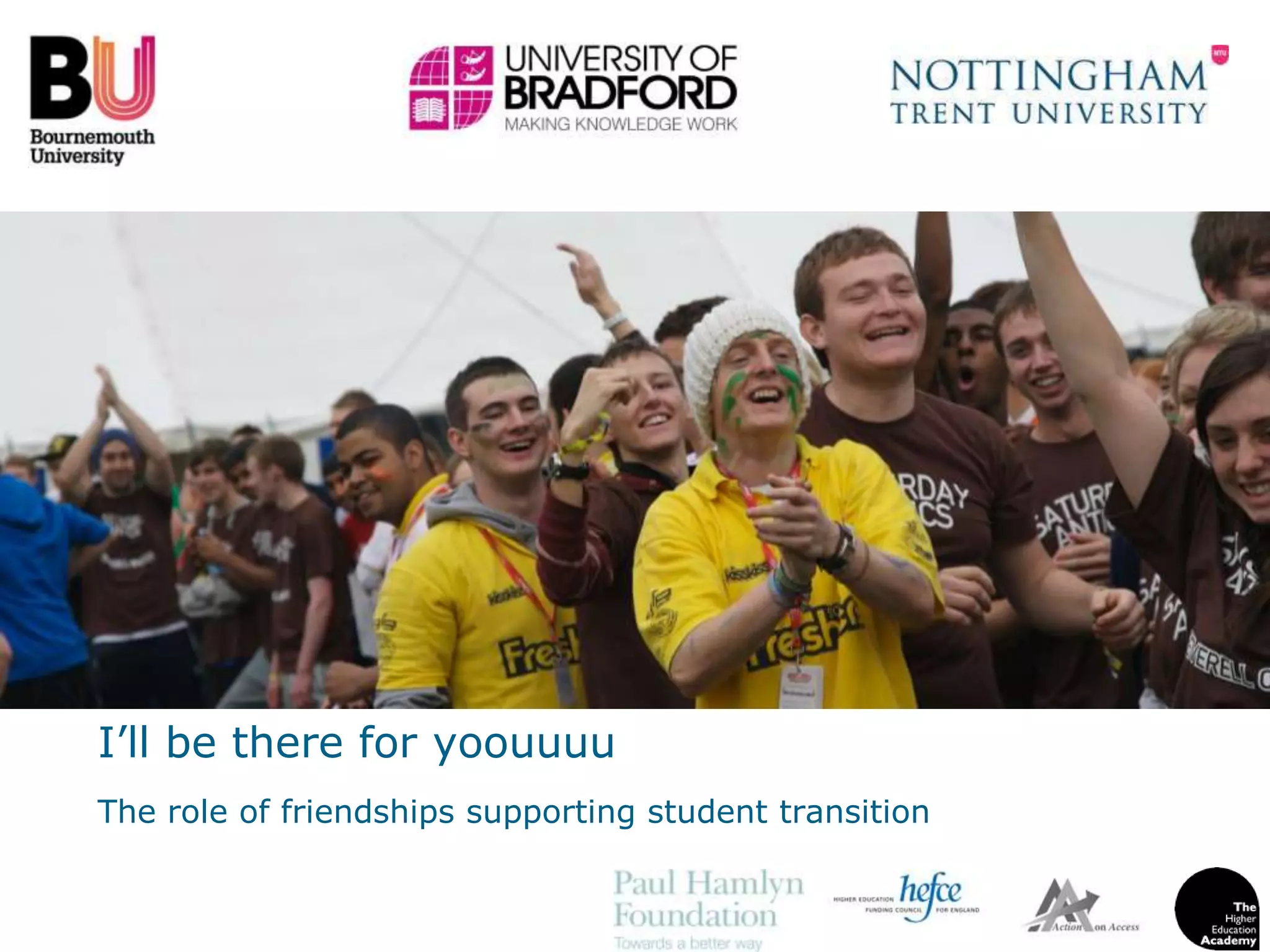 This document discusses the importance of friendships in supporting student transition and retention. It presents findings from research that show social integration and making friends, especially early on, can help students feel like they belong and be more likely to persist in their studies. Specific strategies are suggested to help students make friends, such as icebreakers, organized social activities, and embedding more small group work and interactions into course design. While halls of residence are important locations to form initial friendships, other strategies may be needed to support students not living on campus. Overall, intentionally creating opportunities for friendship formation can help students feel more integrated both socially and academically.